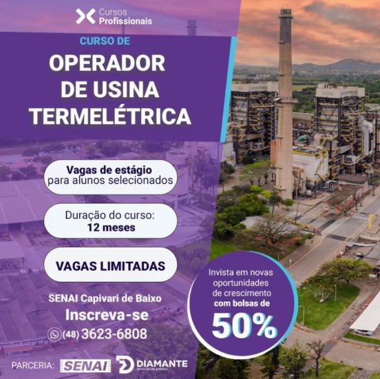 Foi aberta as inscrições para a quarta turma do curso de Operador de Usina Termelétrica, em parceria entre a Diamante Energia e o SENAI de Capivari de Baixo. Com início previsto para fevereiro de 2025, o curso tem duração até dezembro do mesmo ano. As aulas serão no período noturno, de segunda a sexta-feira, das 19h às 22h30, com alguns sábados ao longo do ano.