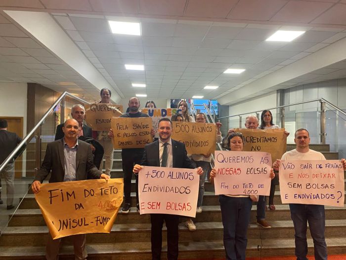 Estudantes da Universidade do Sul de Santa Catarina (Unisul) estiveram mais uma vez na Assembleia Legislativa de Santa Catarina nesta quarta-feira (16) para cobrar alterações nos critérios de admissão do Programa Universidade Gratuita. O grupo foi recebido pelo deputado estadual Pepê Collaço, autor de uma emenda ao Projeto de Lei Complementar que busca garantir a conclusão dos processos seletivos antes do início das matrículas nas universidades.