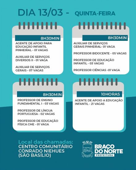 A Prefeitura de Braço do Norte, por meio da Secretaria Municipal de Educação e Desporto, realiza nesta quinta-feira, 13 de março, a terceira chamada para contratação temporária de profissionais ACTs (Admitidos em Caráter Temporário), conforme o Processo Seletivo Público nº 01/2023. A chamada será realizada a partir das 8h30, no Centro Comunitário Conrado Niehues, localizado na Rua João Effting, nº 174, no bairro São Basílio.