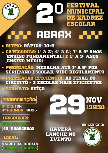 O salão da Igreja do bairro Santa Augusta, em Braço do Norte, será palco, neste sábado (29), do 2º Festival Municipal de Xadrez Escolar, organizado pela ABRAX – Associação Braçonortense de Xadrez. A competição começa às 13h30, com partidas em ritmo rápido de 10+5 minutos, no formato suíço. As inscrições são gratuitas e podem ser realizadas pelo telefone (48) 99996-5502.
