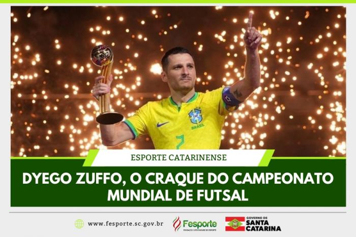 O jogador catarinense Dyego Zuffo foi eleito o grande craque do campeonato mundial de futsal que terminou no último domingo, 6, no Uzbequistão, e consagrou a seleção brasileira com o histórico hexacampeonato na modalidade. Dyego que atua na posição de ala é natural de Palmitos e deixou Santa Catarina ainda no ano de 2013 para atuar no futsal europeu com a camisa do Barcelona, seu clube até os dias atuais.