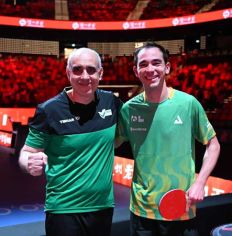 Em busca do bicampeonato, o brasileiro venceu o Alexis Lebrun por 4 sets a 0 e se garantiu na semifinal da Copa do Mundo de Tênis de Mesa