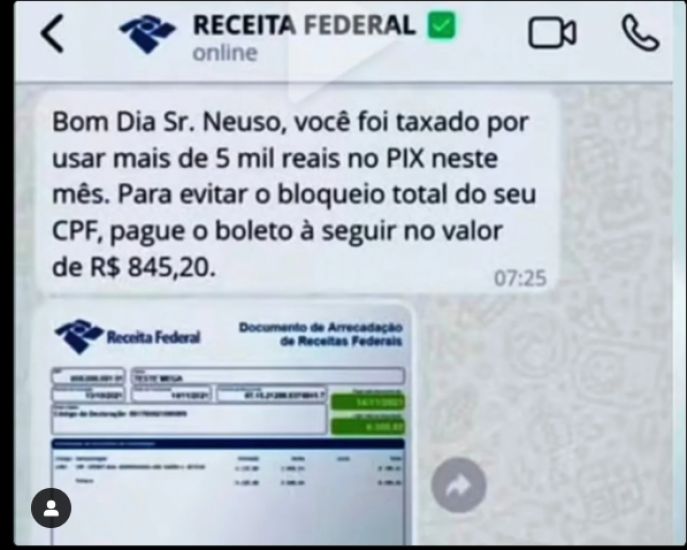 De acordo com a Receita Federal, que emitiu o alerta, golpes feitos por perfis que se passam pelo órgão do governo solicitam o pagamento de uma taxa por transferências acima de R$ 5 mil envolvendo o Pix. A fake news sobre a criação de um imposto sobre as transferências instantâneas desse valor ou mais viralizou desde a semana passada.