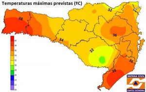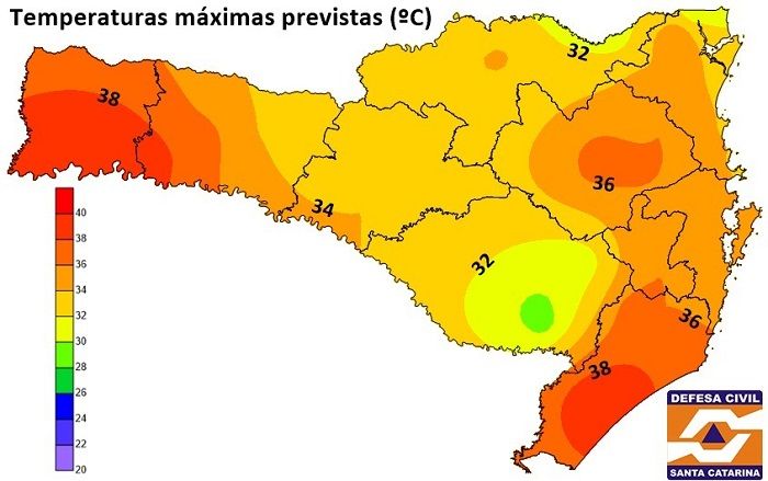 Segundo o meteorologista chefe da Defesa Civil, Murilo Fretta, regiões como o Oeste, Vale do Itajaí, Litoral Sul e Litoral Norte podem registrar extremos superiores aos 40 graus (mapa). Para a região da Grande Florianópolis e Planalto, os termômetros deverão passar dos 30 graus.