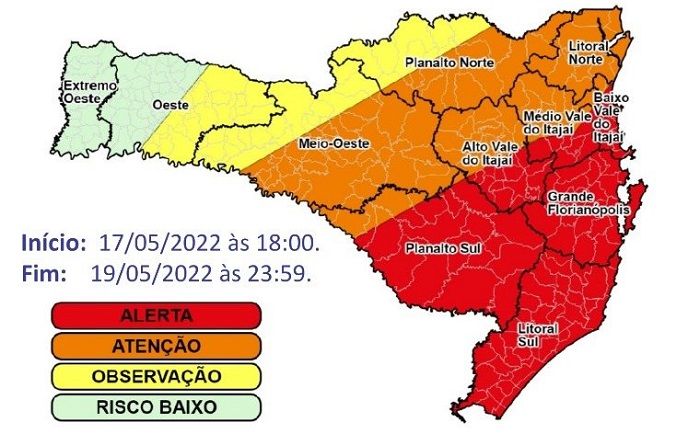 Entre a noite de hoje e a manhã desta quarta, esses ventos se intensificam conforme o ciclone se aproxima do Estado, com rajadas que podem atingir velocidade acima de 100 quilômetros por hora nos pontos mais altos da serra, ficando próximo dos 90km/h no Litoral Sul, na Grande Florianópolis e áreas próximas, chegando aos 75km/h no Alto e Médio Vale do Itajaí, e em torno de 65km/h em áreas do Oeste, Meio-Oeste e Planalto Norte.