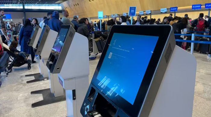 "A gente foi fazer o despacho das bagagens nos totens e viu que não estavam funcionando. Conversamos com uma atendente na Latam, que nos orientou a entrar na fila. De lá para cá, estamos esperando para fazer o despacho das bagagens", disse.