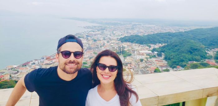 Thaís Melchior e Miguel Coelho cumpriram o ritual: beberam três vezes da fonte e jogaram água para trás, simbolizando o desejo de voltar à Laguna em outras oportunidades.