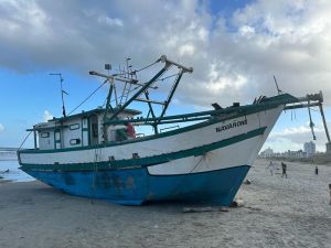 O barco, que encalhou no dia 04 de dezembro do ano passado, foi arrastado para a praia no dia 07 do mesmo mês e permanece lá.