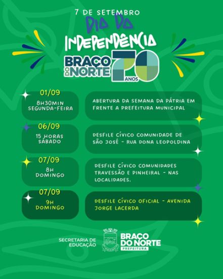 Braço do Norte dará início nesta segunda-feira (1º) à programação da Semana da Pátria 2025. A abertura oficial será realizada às 8h30, em frente à Prefeitura Municipal, marcando o início das atividades cívicas que reúnem escolas, entidades e instituições locais em celebração aos 203 anos da Independência do Brasil e aos 70 anos do município.