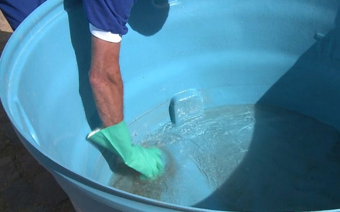 3 - Bloqueie novamente a saída de água e abra o registro. Deixe encher até a altura de um palmo e, em seguida, feche a entrada de água e adicione água sanitária.