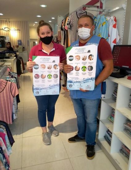 Entre sexta-feira(19) e sábado (20), a equipe da saúde e do turismo visitaram o comércio local para divulgar medidas de prevenção, enfrentamento e combate ao coronavírus no município.