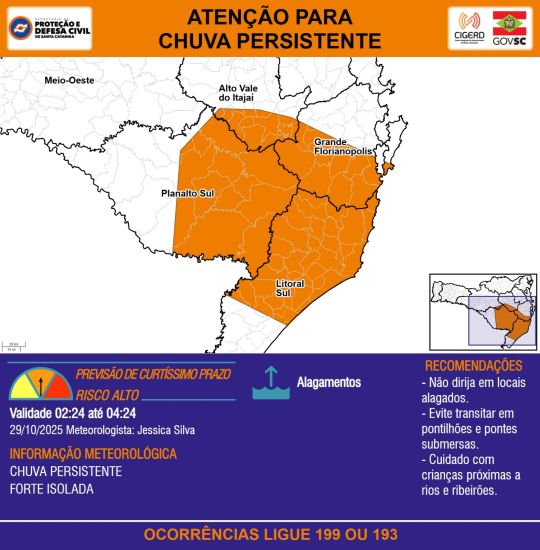 A orientação é para que a população evite trafegar em áreas alagadas ou próximas a rios e córregos que possam transbordar, a fim de prevenir acidentes. A Defesa Civil reforça que qualquer emergência deve ser comunicada pelo número 199.