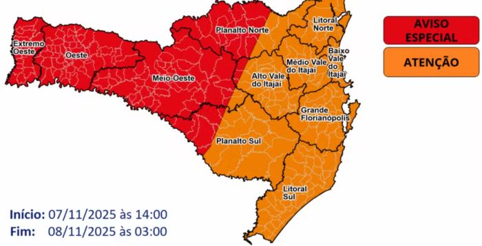 Segundo a Defesa Civil, as primeiras instabilidades devem surgir pela manhã nas áreas próximas à divisa com o Rio Grande do Sul. Entre o fim da tarde e a noite, os temporais devem avançar para a Grande Florianópolis, Vale do Itajaí e Litoral Norte.