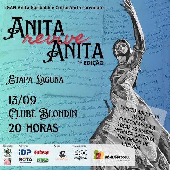 O CulturAnita – Instituto Cultural Anita Garibaldi abre suas portas para uma noite especial de celebração à heroína Anita Garibaldi nesta sexta-feira, dia 13 de, às 20h, no antigo Clube Blondin. O evento contará com a apresentação do renomado Grupo de Artes Nativas Anita Garibaldi, oriundo da cidade de Encantado-RS.