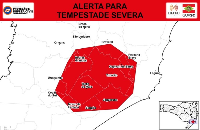 As cidades atingidas são: Braço do Norte, Capivari de Baixo, Cocal do Sul, Gravatal, Jaguaruna, Laguna, Morro da Fumaça, Orleans, Pedras Grandes, Pescaria Brava, Sangão, São Ludgero, Treze de Maio, Tubarão e Urussanga. Em caso de ocorrências, a população deve acionar 199 ou 193.