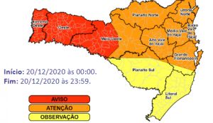 ÚLTIMO AVISO DA DEFESA CIVIL hoje (19), às 14h10 – Temporais isolados, com descargas elétricas, rajadas de vento e granizo para as regiões do Planalto Sul, Litoral Sul e Alto Vale do Itajaí nas próximas três horas. Ocorrências ligue 199 ou 193.