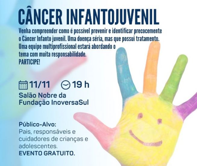 Nesta segunda-feira, 11 de novembro, às 19h, o Salão Nobre da Fundação InoversaSul recebe um evento voltado à conscientização sobre o câncer infantojuvenil. Gratuito e aberto ao público, o encontro busca informar pais, responsáveis e cuidadores sobre formas de prevenção e identificação precoce dessa doença, que possui tratamento.