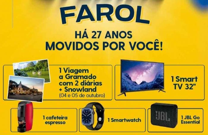 Para celebrar este marco, a Farol Distribuidora lançou uma promoção especial de aniversário. A cada R$ 1.500 em compras, os clientes recebem um cupom para concorrer a prêmios como uma TV Smart de 32 polegadas, uma cafeteira expresso, um smartwatch e uma caixa de som JBL Go Essential. Além disso, a cada R$ 2.000 em compras, os clientes ganham um cupom exclusivo para concorrer a uma viagem para Gramado. Esta promoção visa agradecer e retribuir a confiança dos clientes ao longo dos anos, incentivando ainda mais a parceria e fidelidade.