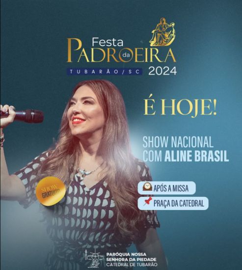 A Festa da Padroeira de Tubarão contará com uma atração especial nesta noite (14). A cantora e compositora católica Aline Brasil fará um show nacional na Praça da Catedral, a partir das 21h30. A entrada é gratuita para o público.