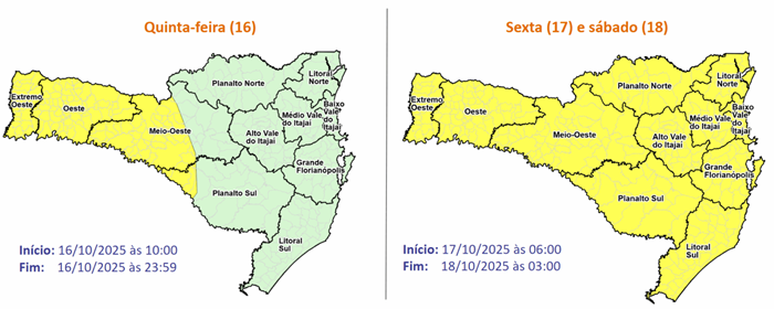 A formação e o avanço de uma frente fria entre quinta-feira (16) e a madrugada de sábado (18) devem provocar temporais isolados e chuva intensa em diferentes regiões de Santa Catarina. O alerta é da Defesa Civil, que aponta risco baixo a moderado para ocorrências como alagamentos, destelhamentos, danos na rede elétrica e queda de galhos.
