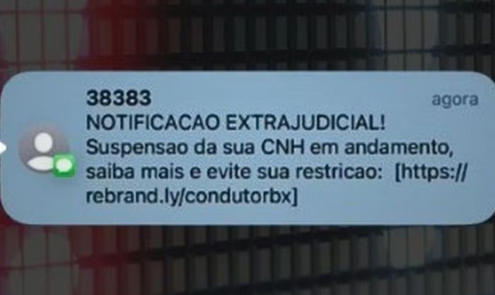 "Suspensão da sua CNH em andamento, saiba mais e evite sua restrição", diz a mensagem golpista que circula pelos celulares, por meio de SMS.