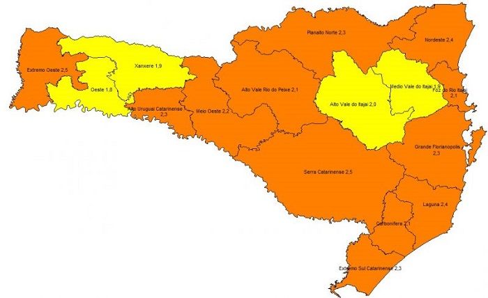 Com a nova classificação, as regiões em nível alto (em amarelo no mapa) são Oeste, Xanxerê, Alto Vale do Itajaí e Médio Vale do Itajaí. Já as demais permanecem consideradas como de risco grave para Covid-19.