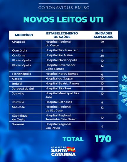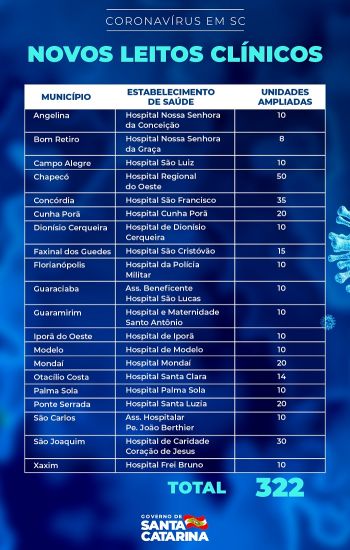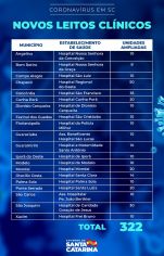 O governo do Estado, por meio da Secretaria da Saúde (SES), pactuou a abertura de 322 novos leitos clínicos e 170 novos leitos de UTI em todas as regiões de Santa Catarina. As unidades foram ampliadas ou estão em processo de ampliação nos últimos 30 dias, em um esforço adicional das equipes estaduais em aumentar a rede de atendimento aos pacientes de Covid-19.