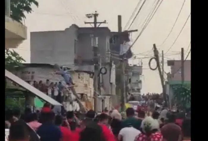 A cruz caiu diretamente sobre os fios de alta tensão de um poste próximo.