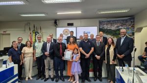 A jornalista Magda Martins, que atualmente trabalha no Grupo Hiper, recebeu uma homenagem na Câmara de Vereadores de Tubarão nesta segunda-feira, dia 29. A partir da moção 70/2024, apresentada pelo vereador Zaga Reis, foi entregue a comenda para a jornalista pelo destaque nas suas atividades profissionais e pessoais.