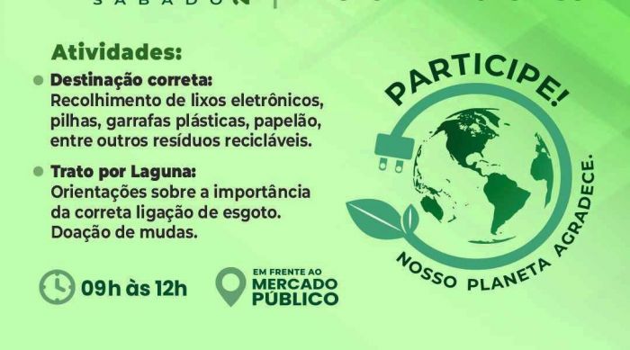 A ação será das 9h às 12h, em frente ao Mercado Público, e tem como objetivo recolher diversos tipos de resíduos, tais como lixos eletrônicos, pilhas, pets, papelão, entre outros materiais recicláveis. Além disso, equipes do programa Trato por Laguna estarão orientando sobre a regularização do sistema de esgoto.