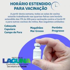 A partir desta semana, as salas de vacina, em Laguna, estarão abertas todas as quartas-feiras em horário estendido, das 17h às 20h, para a imunização contra a Covid-19 e outras vacinas, nas seguintes unidades: