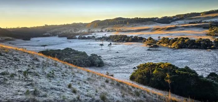 As mínimas devem variar entre 2 e 6°C no Planalto Sul e entre 5 e 10°C no Grande Oeste. Já em áreas do Litoral Sul, os registros podem ficar pontualmente abaixo dos 10°C.
