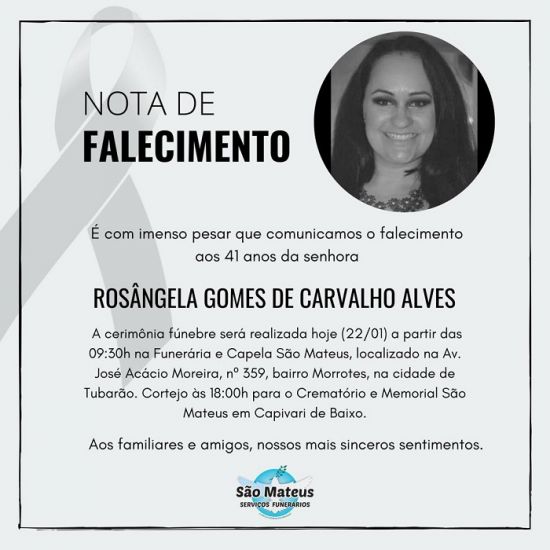 A tubaronense Rosangela Gomes de Carvalho Alves, conhecida como Danda Rô, morreu na madrugada deste sábado (22), aos 41 anos. Guerreira, travava uma batalha contra o câncer há cerca de cinco anos.