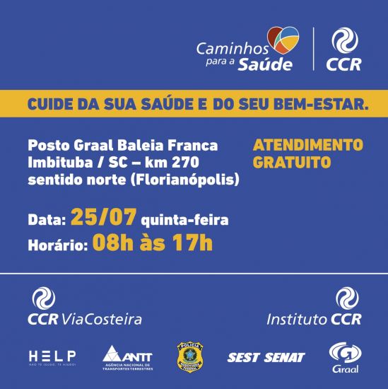 Em uma iniciativa do Programa Caminhos para a Saúde, do Instituto CCR, a concessionária realizará um check-up completo de veículos e serviços de saúde no Autoposto Graal Baleia, localizado no km 270, em Imbituba. Os atendimentos ocorrerão das 8h às 17h.