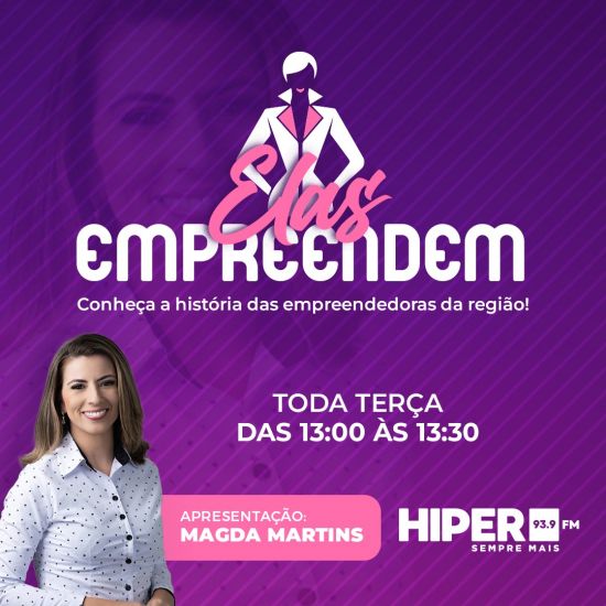 Nesta terça-feira (07), às 13h, estreia na programação da Hiper FM o programa “Elas Empreendem", com a apresentação da jornalista Magda Martins. A cada semana a apresentadora irá entrevistar uma empreendedora da região da Amurel, que virá no estúdio compartilhar um pouco da sua trajetória e inspirar outras mulheres a acreditarem no seu pontencial.