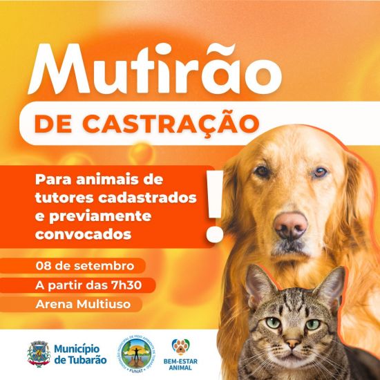 A Fundação Municipal de Meio Ambiente (Funat), em parceria com a Universidade do Sul de Santa Catarina (Unisul), promoverá mais um mutirão de castração de cães e gatos neste domingo, 8 de setembro. O evento, que visa o controle populacional desses animais no município de Tubarão, ocorrerá na Arena Multiuso, com início às 7h30.