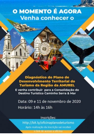 A oficina do dia 09 tem a finalidade de fazer a “Apresentação dos resultados do diagnóstico da Área e das Atividades turísticas”. No dia 11, o objetivo é a “Construção das ações estratégicas do Plano de Desenvolvimento Territorial do Turismo do Caminho Serra & Mar SC” pelo grande grupo presente on-line. O material será apresentado pela empresa Interface Hospitalidade Sustentável. O Plano está sendo elaborado através do convênio CIM-Amurel com o Ministério do Turismo.