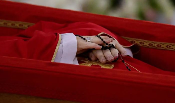 De acordo com a Santa Sé, o caixão foi colocado em frente ao Altar da Confissão, na Basílica de São Pedro, onde o coro cantou a Ladainha dos Santos em latim “para o repouso de sua alma”. O cardeal camerlengo Kevin Farrel conduziu uma breve liturgia que incluiu uma leitura do Evangelho de João sobre o amor de Jesus por seus discípulos.