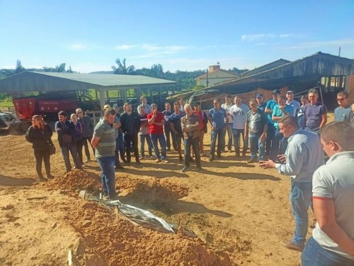 No dia 31 de março os produtores de leite se reuniram na propriedade de Anderson Viel, que é uma Unidade de Referência Técnica (URT) em irrigação de pastagens, onde conheceram técnicas de sobressemeadura e de implantação de pastagens de inverno, além de estratégias para uso de silagens, com enfoque em silagem de pasto.