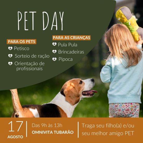 No dia 17 de agosto, das 9h às 13h, a farmácia de manipulação Omnivita em Tubarão será palco do Pet Day, um evento realizado em conjunto com o grupo Hiper e outros parceiros e voltado para famílias e seus animais de estimação. Durante a manhã, os pets poderão desfrutar de petiscos, participar de sorteios de ração e receber orientação de profissionais especializados.