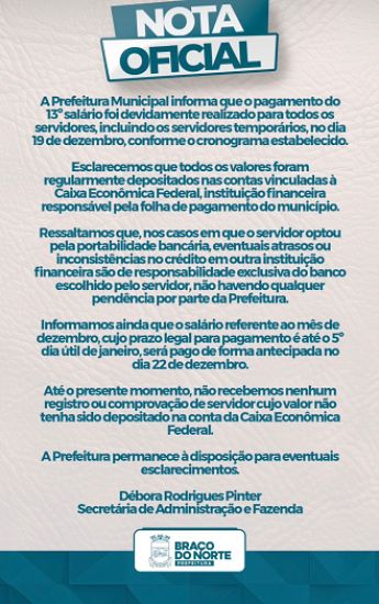 Após a repercussão de relatos de servidores sobre o não recebimento da segunda parcela do 13º salário, a Prefeitura de Braço do Norte divulgou nota oficial na tarde deste domingo (21), esclarecendo que o pagamento foi realizado no dia 19 de dezembro para todos os servidores, incluindo temporários, conforme o cronograma estabelecido.