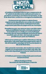 Esclarecemos que todos os valores foram regularmente depositados nas contas vinculadas à Caixa Econômica Federal, instituição financeira responsável pela folha de pagamento do município.