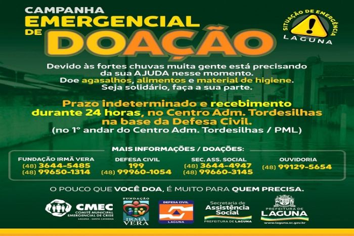 As chuvas que atingem a região desde terça-feira (08), tem deixado diversos lagunenses com dificuldades. Muitas famílias precisaram sair de suas casas devido aos alagamentos e riscos de deslizamento nas regiões. A Prefeitura Municipal, por meio da Secretaria de Assistência Social e Habitação, lançou uma campanha de auxílio às pessoas atingidas pelos temporais.