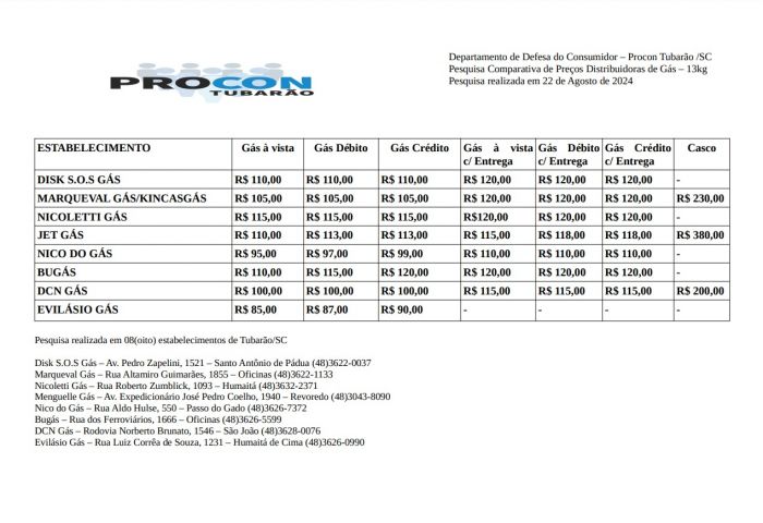 O Procon de Tubarão divulgou os resultados da pesquisa de preços do gás de cozinha referente ao mês de agosto. O levantamento indicou que o preço do botijão de gás, com entrega em domicílio, varia entre R$ 110,00 e R$ 120,00. Já nos depósitos, os valores encontrados foram mais baixos, oscilando entre R$ 85,00 e R$ 115,00.
