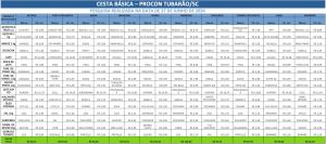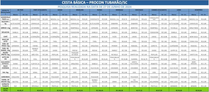 O Procon de Tubarão realizou uma pesquisa de preços da cesta básica, referente ao mês de junho, na última quinta-feira (27). O levantamento abrangeu dez supermercados da cidade e incluiu a coleta de valores cobrados por 16 produtos em cada estabelecimento.