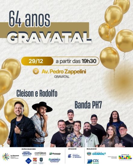 A programação para o Réveillon e para o aniversário de 64 anos de Gravatal foi definida pela prefeitura e ocorrerá na Avenida Pedro Zappelini, com atrações musicais e atividades institucionais voltadas à comunidade.