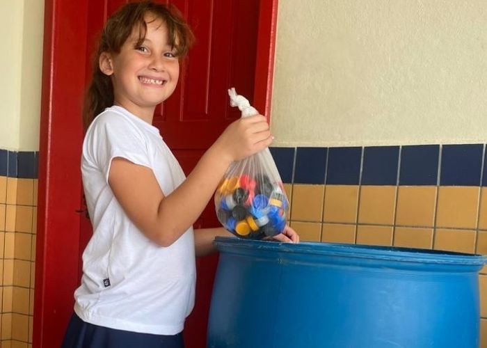 Os alunos do 1º ao 5º ano arrecadam tampinhas plásticas, promovendo a conscientização ambiental e o reaproveitamento de resíduos. Os materiais coletados são destinados a uma instituição parceira para reciclagem, e o valor obtido com a venda é revertido para ações sociais e melhorias na escola.