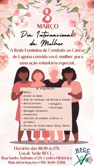 No próximo dia 08 de março, segunda-feira, a Rede Feminina de Combate ao Câncer de Laguna vai realizar uma série de atividades em homenagem ao Dia Internacional da Mulher. O evento, que é aberto à comunidade em geral, tem como objetivo conscientizar as mulheres sobre a importância da prevenção e do diagnóstico precoce do câncer de útero e de mama, além de oferecer serviços de saúde e bem-estar.