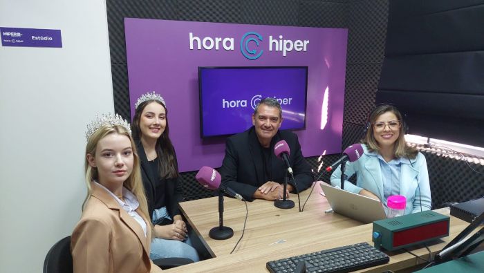O prefeito de Pedras Grandes, Agnaldo Filippi, acompanhado da rainha Isabel Filippi, e da princesa Lívia Masiero, esteve ao Jornal Hora Hiper desta segunda-feira