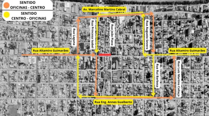 Sentido Centro – Oficinas: pelas ruas Rui Barbosa, Engenheiro Annes Gualberto e Laguna; ou pelas ruas Augusto Severo, Avenida Marcolino Martins Cabral e Laguna.